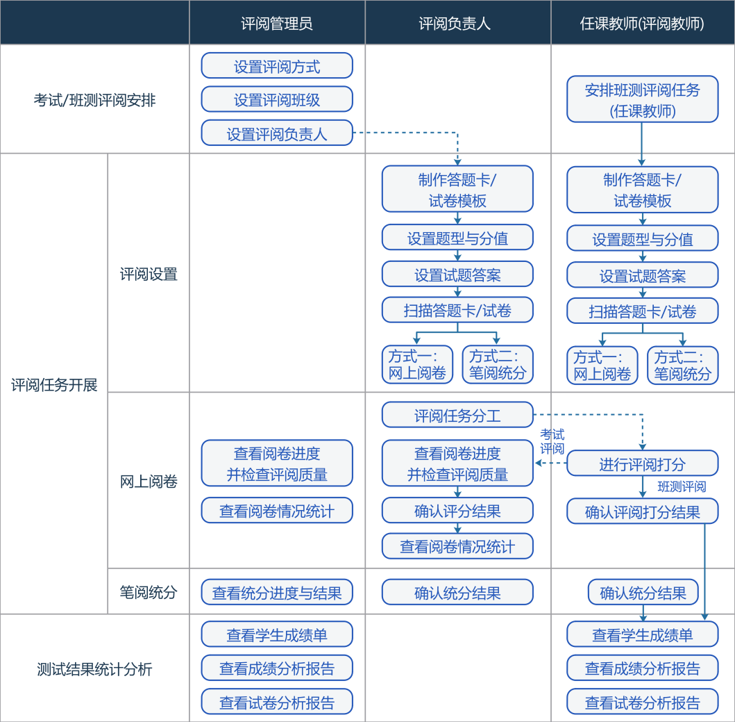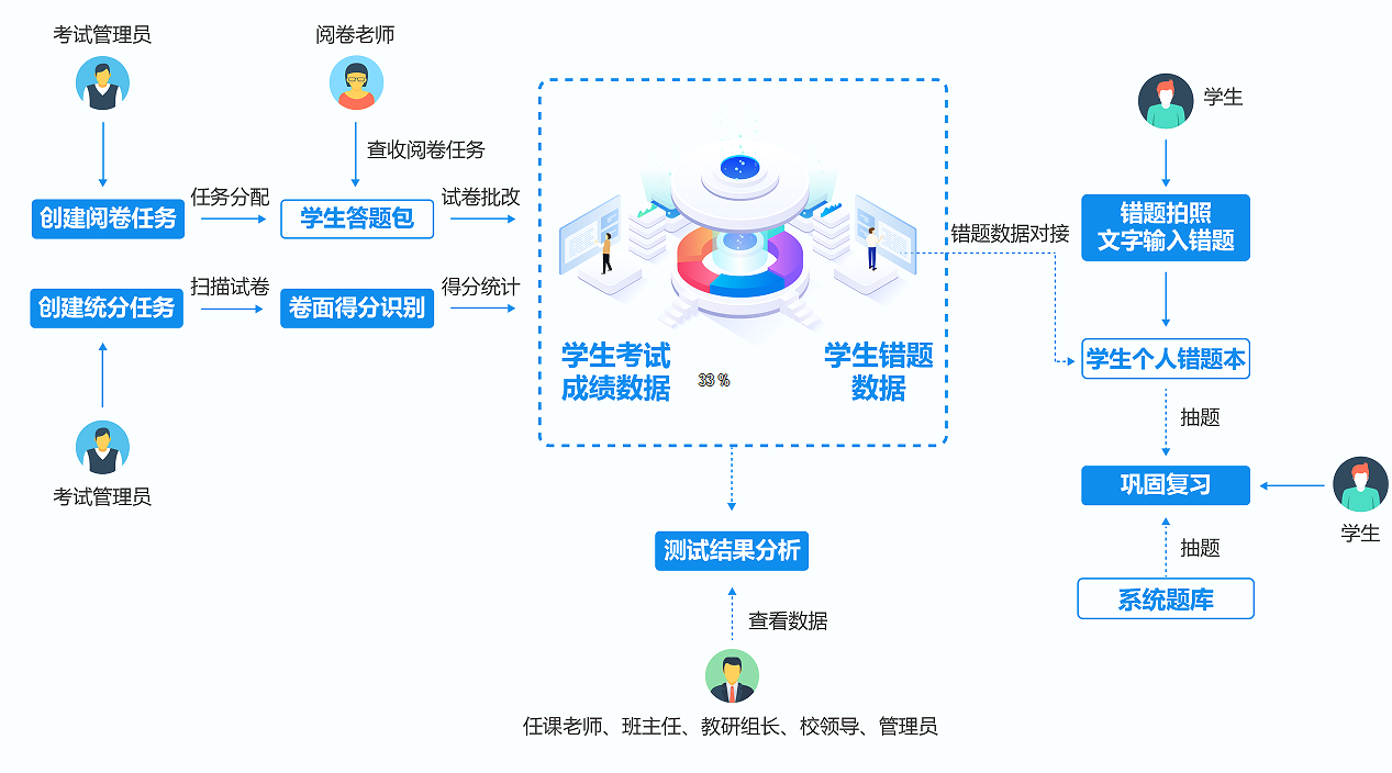 平台主要由通用学科试卷(作业)评阅系统和智能错题采集及复习系统组成,涵盖在线阅卷、自动统分、数据统计分析、错题智能采集、错题复习、学情分析等功能模块,为学生查漏补缺、教师针对性辅导、校领导科学管理提供服务。主要业务示意图如下所示: