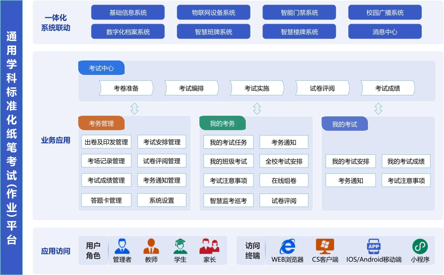 纸笔课堂精准教学平台利用大数据分析和智能图像处理技术,采集学生作业和考试数据,助力学校科学管理、教师精准教学和学生个性化学习。平台包括试卷(作业)评阅和智能错题采集及复习系统,支持与大数据、成绩管理等系统对接,实现资源互通;同时,平台采用灵活的集成部署机制,各应用模块既可独立应用于各教学环节,也同时支持系统集成的一体化联动应用,满足多种教学场景需求。
